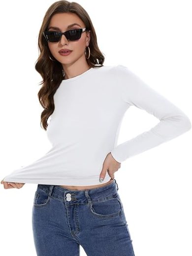 Womens Long Sleeve Shirts Basic Tees Y2k Slim Fit T Shirt Crew Neck Trendy Crop Top Casual