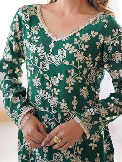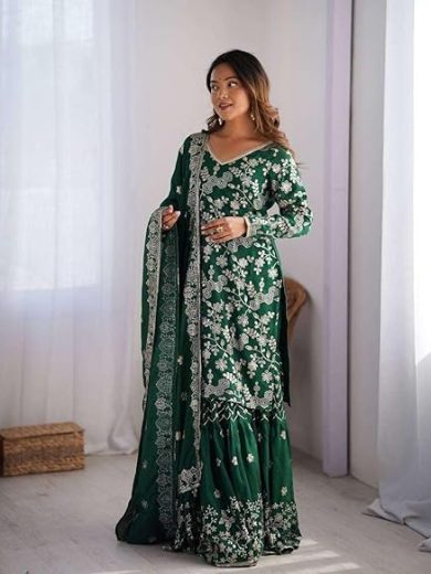 DONE WITH LOVE Women's Chinon Silk Embroidery Sequence Work Straight Kurti With Sharara Suit and Dupatta Set (Green-XXL)