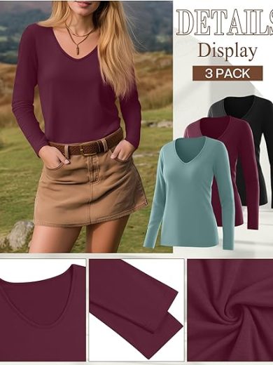 Ficerd 3 Pack Women's Long Sleeve T Shirts, V Neck Basic Tops Fall Casual Trendy Tees Loose Fit Soft Clothes Outfits